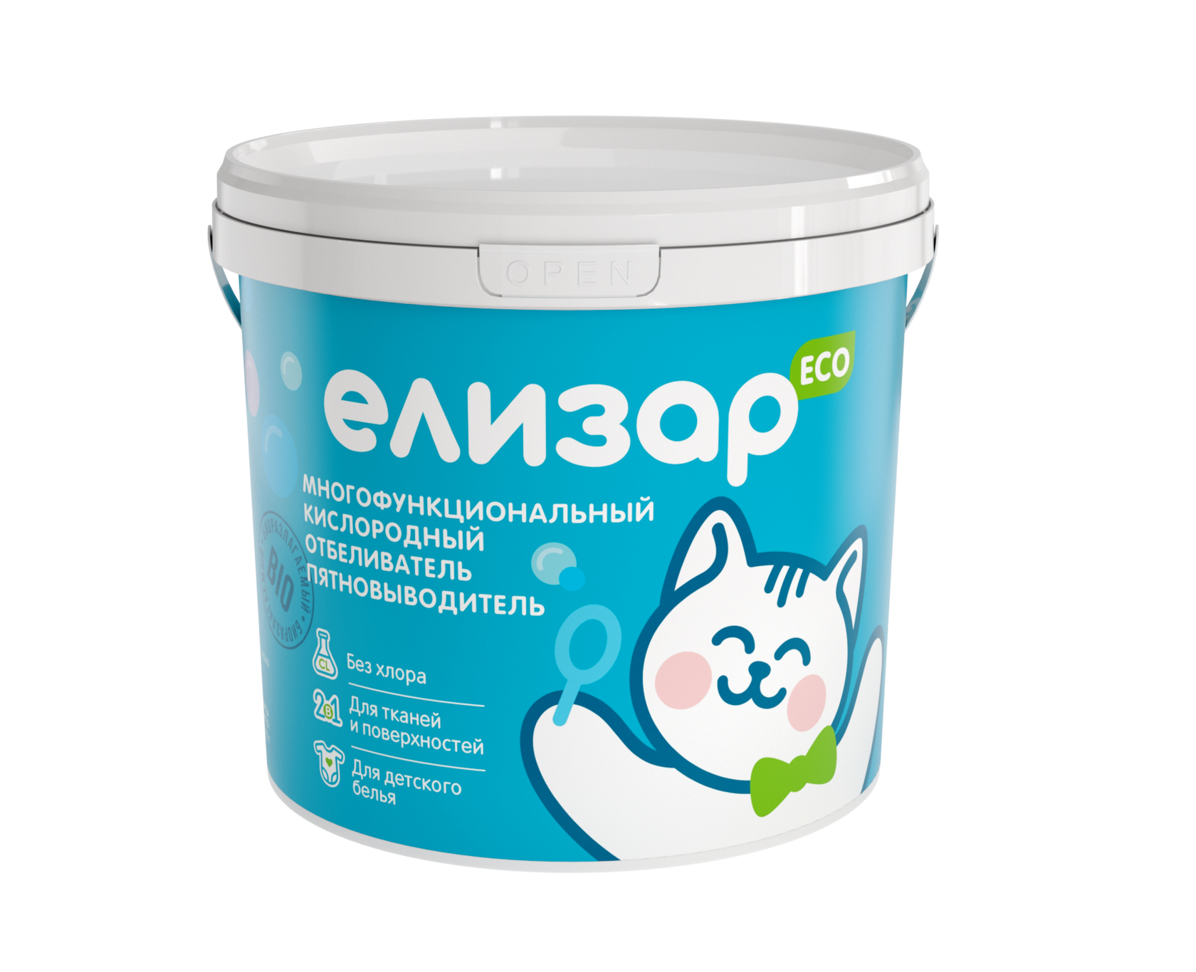Kislorodli oqartiruvchi - dog 'olib tashlash vositasi Elizar organik kelib chiqadigan har qanday ifloslantiruvchi moddalarni: o't va tuproqdagi dog'larni, ichimliklar va oziq-ovqatlarni, yog'larni va qonni osongina olib tashlaydi. Oq va rangli matolar uchun xavfsiz. Matolar, gilamlar, plastmassa, emal yuzalar, zanglamaydigan po'lat, plitkalar, shisha, sopol idishlar, shisha keramika, kauchuk, silikondan kirni samarali tarzda tozalaydi.